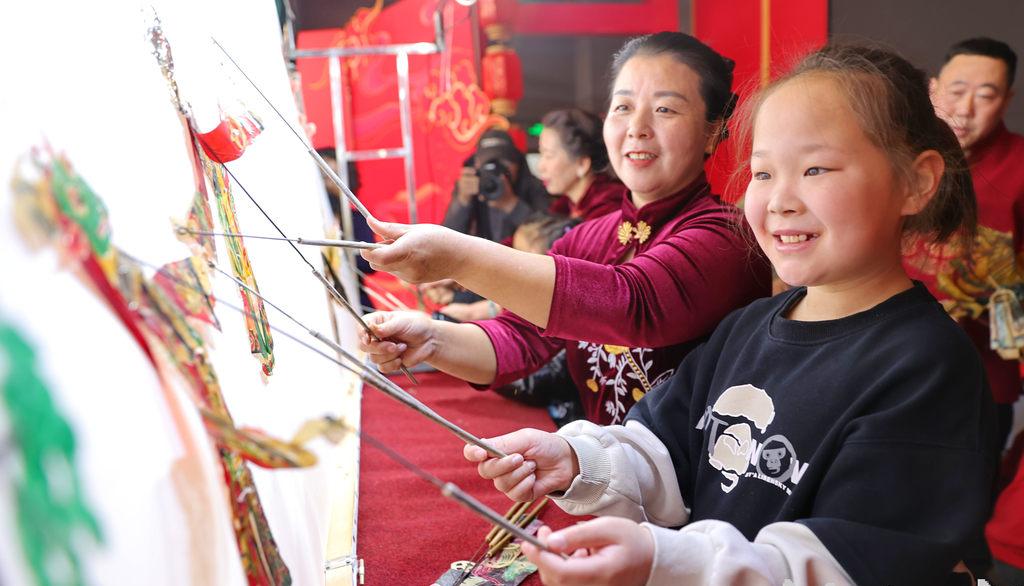 1月31日,民間藝人在秦皇島博物館帶領(lǐng)小朋友體驗皮影。