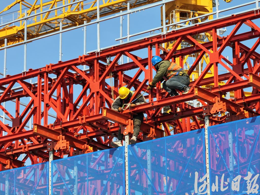 2月19日,雄安城際站及國貿(mào)中心片區(qū)建設(shè)現(xiàn)場(chǎng),工人們正在搭建造樓機(jī)。河北日?qǐng)?bào)記者李暢攝