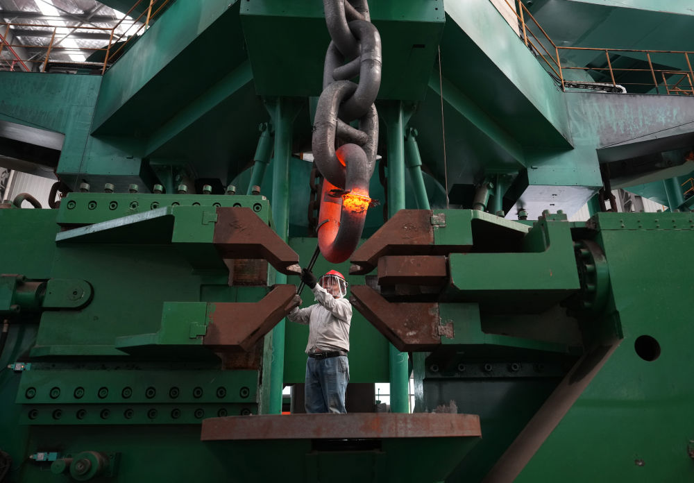 2024年6月4日,江蘇泰州靖江市江蘇亞星錨鏈股份有限公司工人在生產(chǎn)車間作業(yè)。該公司前身是40多年前創(chuàng)辦于靖江東興鎮(zhèn)的一個(gè)小廠,經(jīng)過多年發(fā)展,逐漸成長為國家級(jí)制造業(yè)單項(xiàng)冠軍示范企業(yè)。目前該公司船用鏈條全國市占率達(dá)70%,全球市占率超50%,業(yè)務(wù)已拓展到海洋鉆井平臺(tái)、海洋生產(chǎn)平臺(tái)、海上風(fēng)電設(shè)施的系泊錨鏈等領(lǐng)域。
