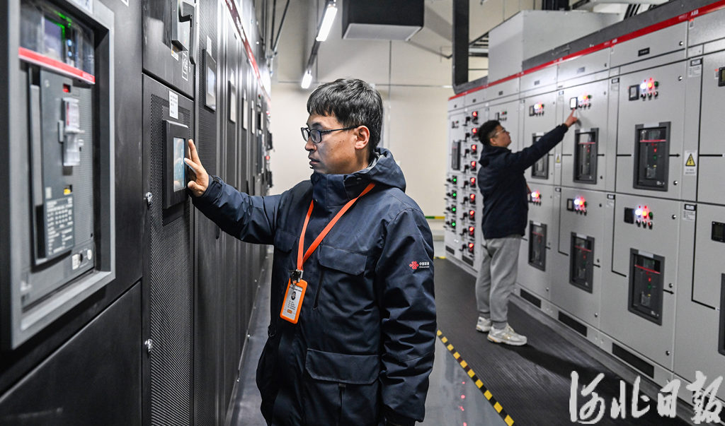 2月25日,位于懷來縣的中國聯(lián)通(懷來)大數(shù)據(jù)創(chuàng)新產(chǎn)業(yè)園工作人員在檢查設備運行情況。河北日報記者耿輝攝