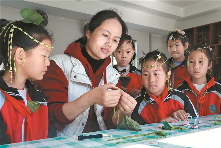 藝術(shù)創(chuàng)作課堂上,美術(shù)老師和同學(xué)們用紅薯葉制作首飾。