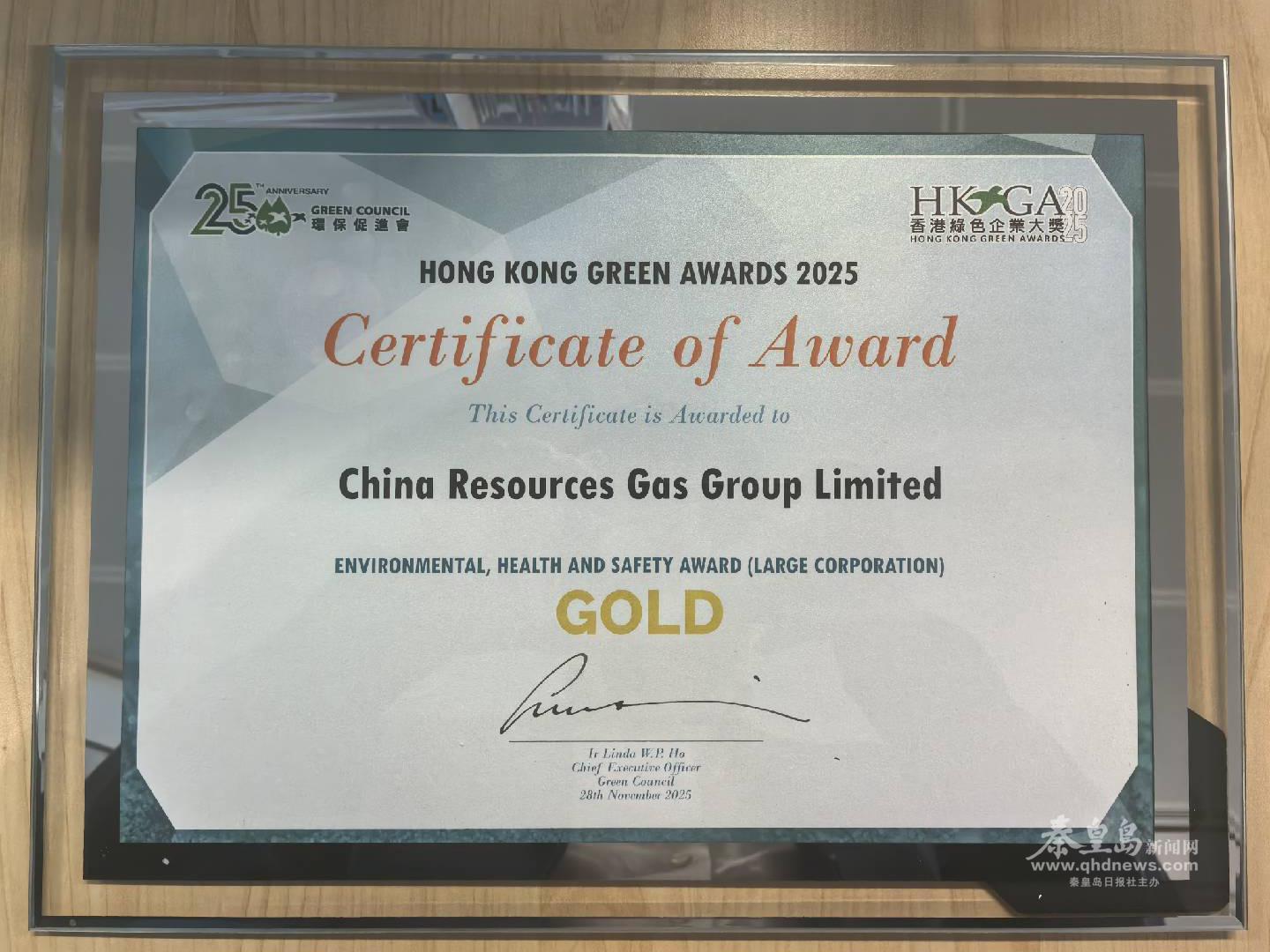 華潤燃氣榮獲2025年香港綠色企業(yè)大獎“超卓環(huán)保安全健康獎”金獎