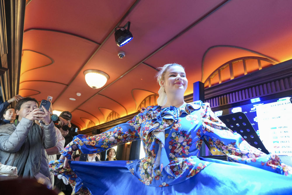 2025年12月6日,演員在黑龍江省“伊春號”旅游專列車廂中表演。當日,“伊春號”旅游專列投入試運行,40余名受邀體驗的游客乘專列由哈爾濱站出發(fā),去往亞布力滑雪旅游度假區(qū)。2025年以來,中國鐵路哈爾濱局集團有限公司陸續(xù)開行了多趟旅游列車,將特色體驗、民俗展示、定制化服務等進行融合,滿足游客需求,服務旅客出行。