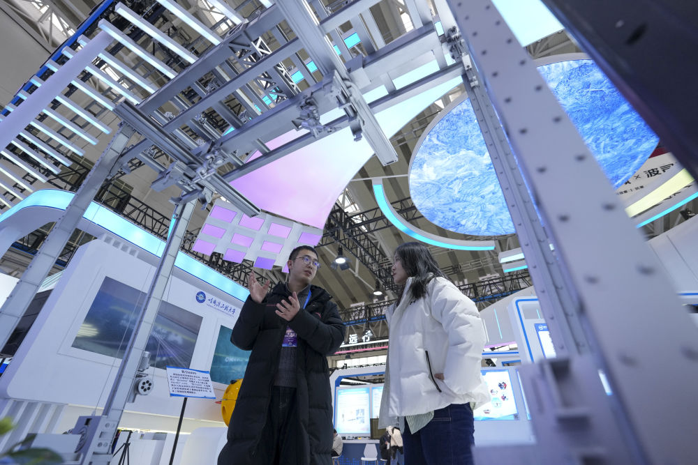 2026年1月6日,在2026哈爾濱國際冰雪經濟博覽會展會現場,參會嘉賓(左)為參觀者介紹智能大型冰雕自動化搭建機器人。本屆博覽會旨在通過成果展示、產業(yè)交流與投資合作,展現“冰雪+經濟”“冰雪+科技”等融合發(fā)展成果,為全球投資者提供市場機遇。