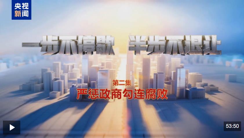 由中央紀(jì)委國家監(jiān)委宣傳部與中央廣播電視總臺央視聯(lián)合攝制的電視專題片《一步不停歇 半步不退讓》,1月12日在總臺央視綜合頻道晚8點檔播出第二集《嚴(yán)懲政商勾連腐敗》,央視新聞新媒體平臺同步播發(fā)。