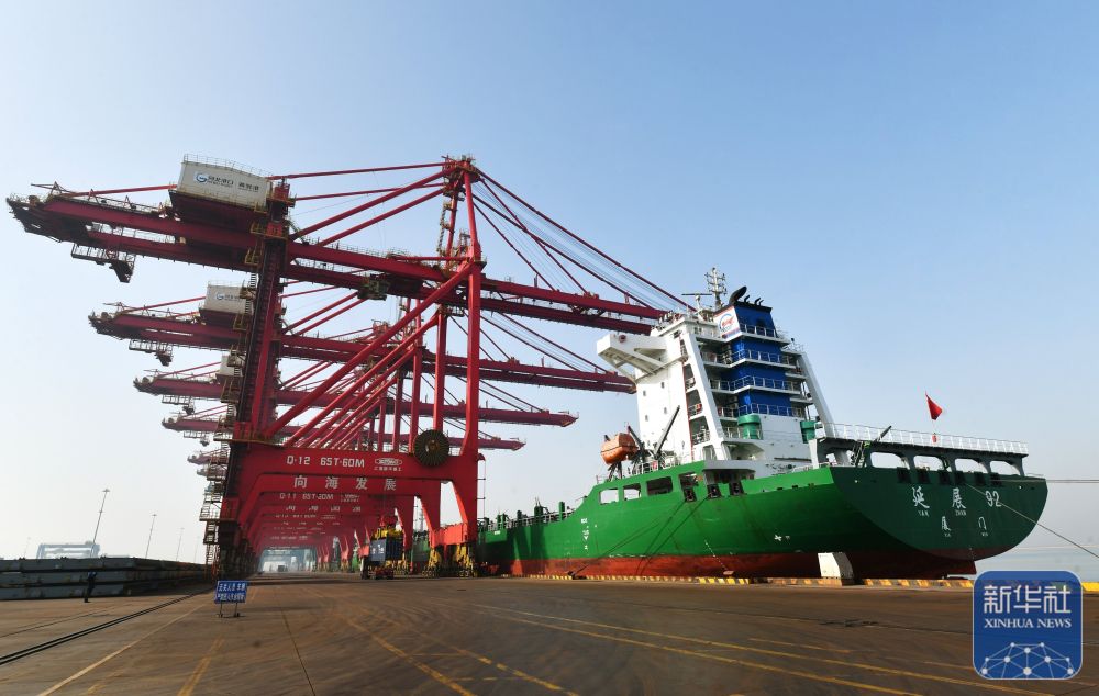 ↑ 1月15日,一艘貨輪靠泊在黃驊港綜合港區(qū)集裝箱碼頭。