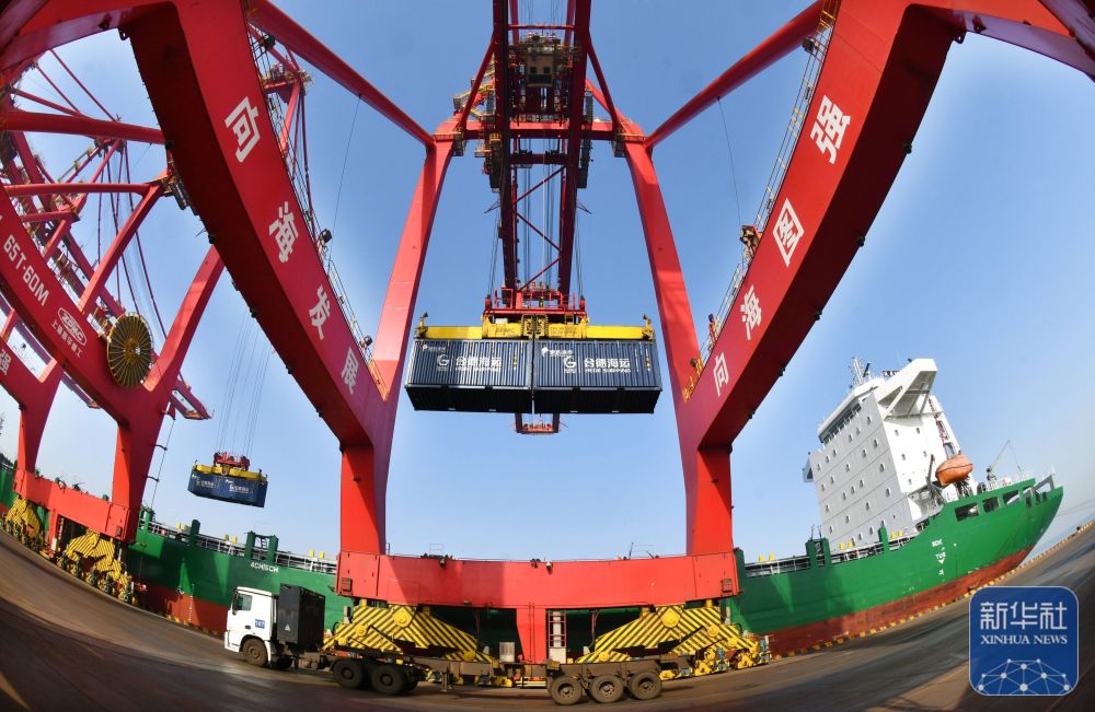 ↑ 1月15日,在黃驊港綜合港區(qū)集裝箱碼頭,岸橋設備在進行卸船作業(yè)。