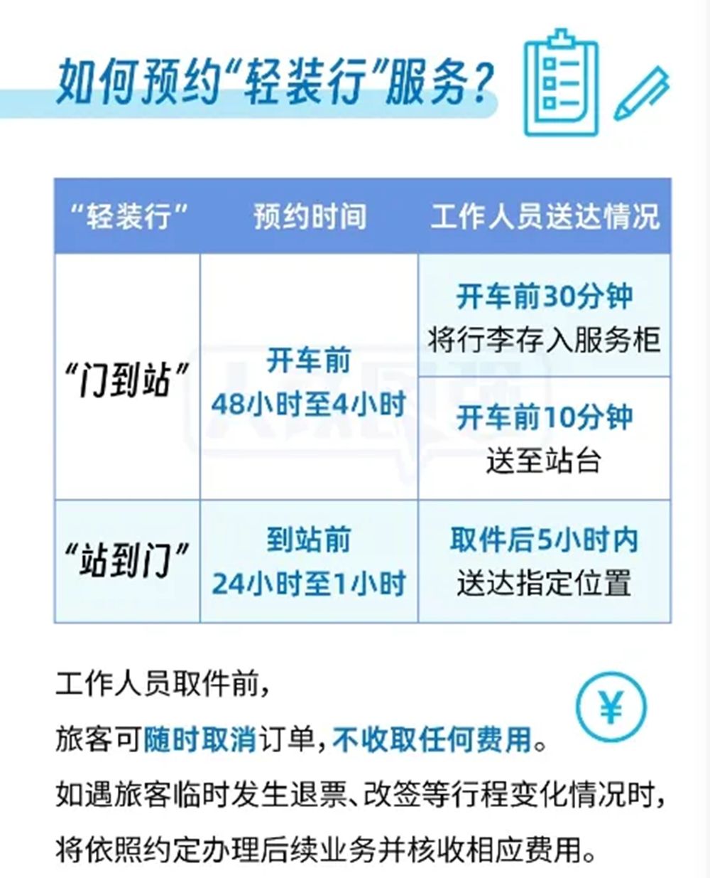“輕裝行”是鐵路部門為旅客出行提供的“門到站”“站到門”同城行李搬運服務(wù)。在同城距離車站35公里內(nèi),旅客根據(jù)實際需要可選擇以下兩種“輕裝行”服務(wù)。